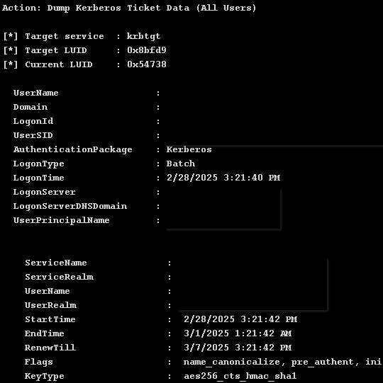 Specifying a LUID and the service to be dumped, rubeus can provide the ticket. Dumped tickets can then be added to CS credentials tab manually for further use. Good example to save in credentials are golden and diamond tickets or domain admin TGTs.