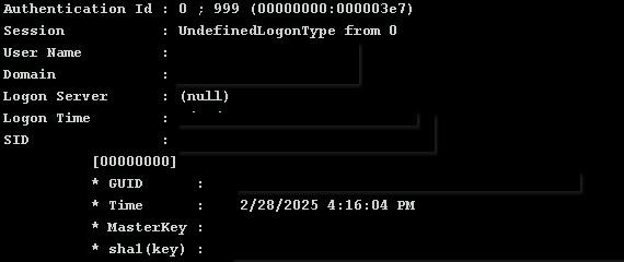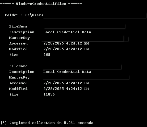 Seatbelt can also be used to enumerate these credential blobs. DPAPI requires decrypting a masterkey to obtain the encryption key used to encrypt individual blobs. Here we show listing masterkeys using mimikatz.