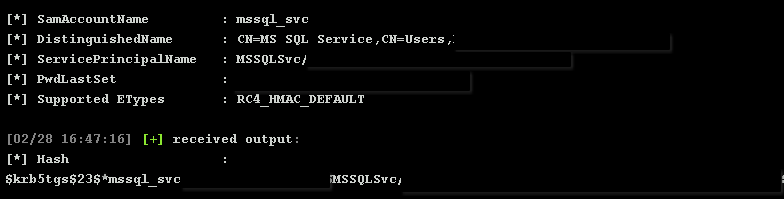 Kerberoasting a specified user, using rubeus. These need to be cracked later to reveal the password, which may be hit of miss.