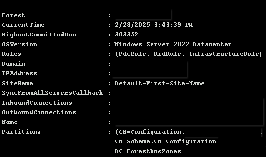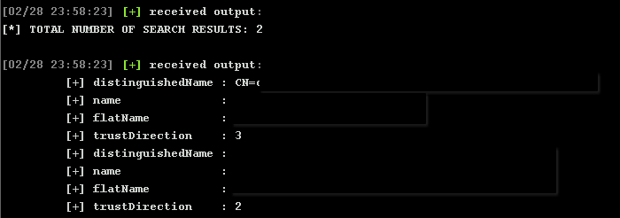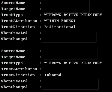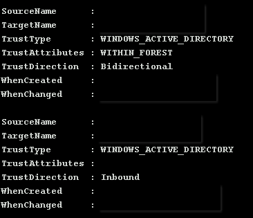 Discovering the layout of the entire domain, one of the most important targets in some engagements is the DC. Get-DomainController filtering for properties can be used to do just that. Listing inbound and outbound domain trusts provides the entire scope for forest hopping. Get-DomainTrust lists all domain trusts with the trust direction, source and target names and attributes.