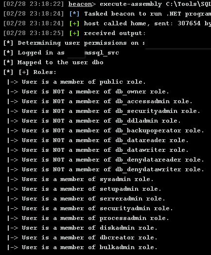 Spawned beacons from previous commands are low privileged MSSQLSERVICE accounts under NT Service.