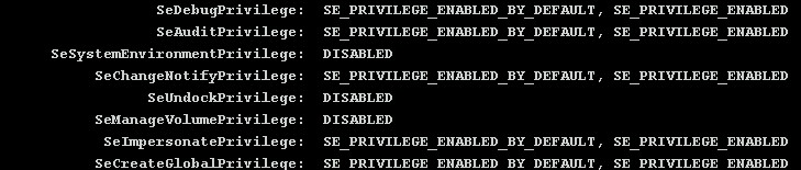 Seatbelt can also find privileges among other vectors. This is an example of SeImpersonate privileges often found on NT Service accounts.