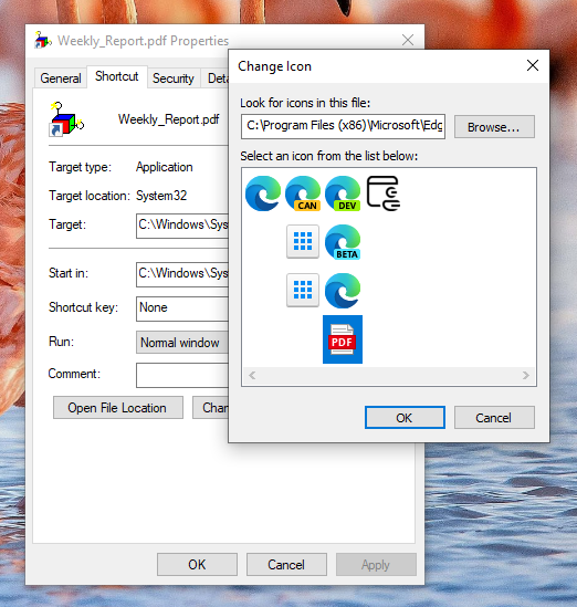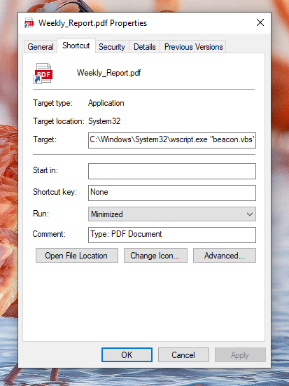 Microsoft Windows allows the creation of shortcuts with any extension and file icon types - this should set off all alarm bells in anyones head. We can create a file that looks like anything we want, the only limit is our creativity. We created a pdf shortcut as an example, since many workplace environments like to share and open pdfs for reports, updates, bill of materials, etc.