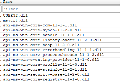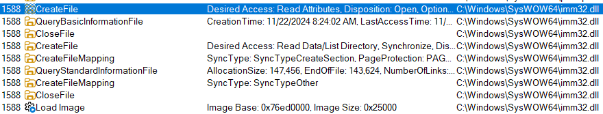 The typical operations for all DLLs listed above are listed. The operations follows a file open (even though it says CreateFile), perhaps to check for permissions or a file is needed to be opened before allocating in memory. Then, a CreateFileMapping is called to allocate a section in memory with the permissions requested. The DLLs are given read write and execute permissions for the allocated space, meaning this space can be used to execute code by other services. We suspect these DLLs that are loaded may just be address space the beacon uses to execute any command requested by the C2 server. Later, the operations are to close the file using CloseFile and loaded into memory with Load Image at the base address shown and size specified. The example here is for imm32.dll.