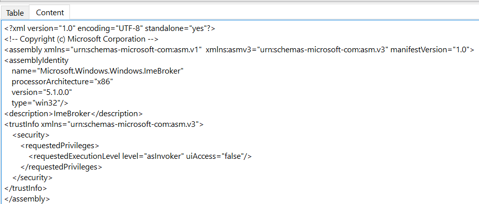 Loading the backup file onto DiE does validate what we found earlier, the file is a PE32 executable compiled on Microsoft Visual. The file is not packed. The strings output and libraries output is too long to include in this report, but we included the libraries and leave it to the readers to view the next sections of this report for an analysis of the executable. A quick glance at the libraries does tell us some of the functionality, SHELL32.dll and SHLWAPI.dll is shell execution and file access. MSVCRT.dll does also reveal string manipulation, memory management operations and input-output management. ADVAPI32.dll is management of tasks, services and user accounts. All these directly line up with the functionality of CO.A detailed view shown of the resources section of the CO beacon. It shows the number of ID and named entries, the value of these entries and content. The content of manifest is the most interesting here where ImeBroker is named because it is a normal Windows executable used to input characters of languages other than the default. This may hint at process injection into ImeBroker.