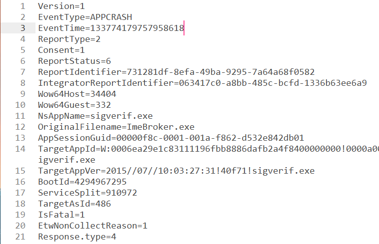 Some of the contents of the crash report is show . No clue as to whether this is a real process crash or an exception handler output. We can also see the original file name as ImeBroker.exe which is what we discovered earlier in the static analysis section.