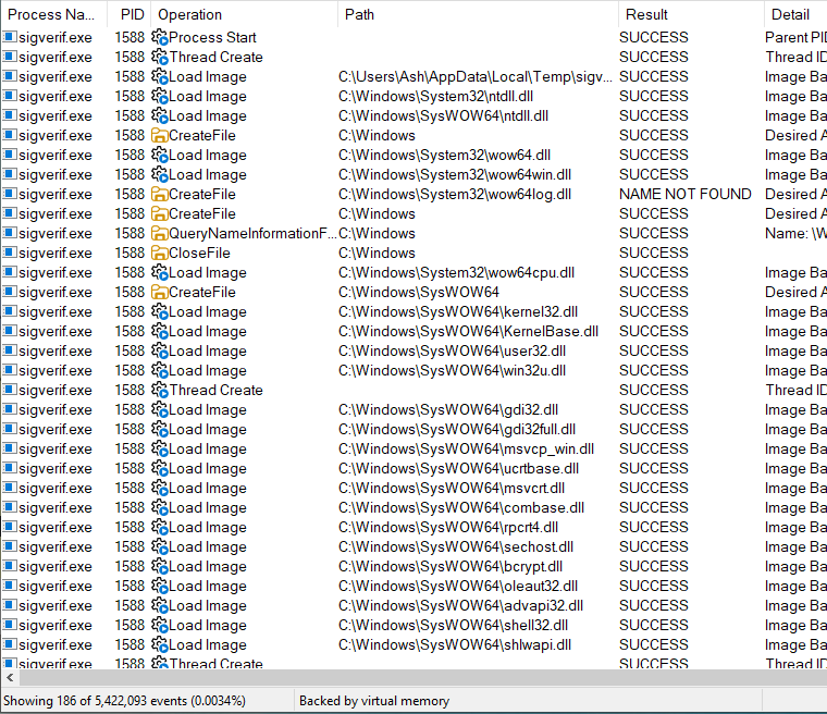 A simple filter applied in process explorer to include all mentions of sigverif.exe process name results in what is shown. We see a total of 186 operations coming from the sigverif binary alone.