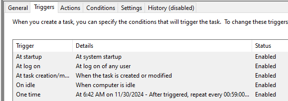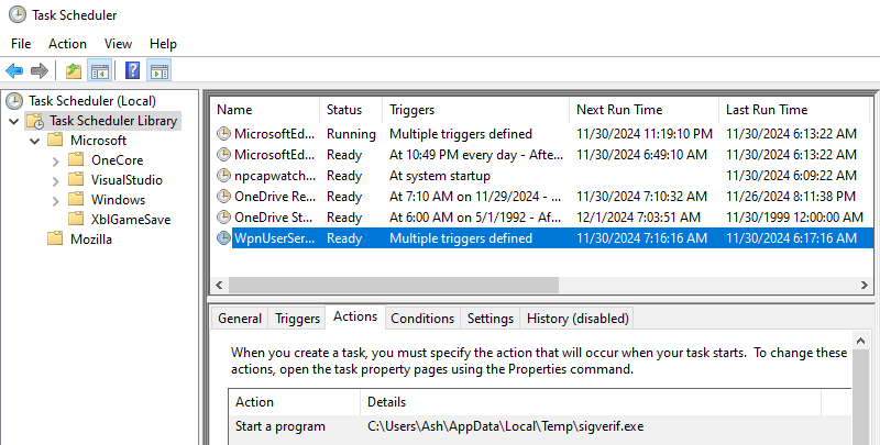 Prior to recording modifications made to the registry editor, during static analysis we found a sched- uled task being set if the user was an administrator on the local machine. We can easily check for this using the Task Scheduler. A new scheduled task WpnUserService is created, with the action starting the CO beacon sigverif.exe shown with the full path. Note the last run time and next run time columns show a difference of 24 hours, so we know the beacon triggers every full day.We can see the full list of triggers. The beacon triggers on startup, during logon of any user, on task creation and modification, on idle time and every 59 minutes. Most of these are self-explanatory however we are unsure whether the trigger during logon of any user would give a reverse shell of that logged user, or the user that created the task. The difference is massive as this would mean lateral or vertical escalation if the process inherits the user who logged in.