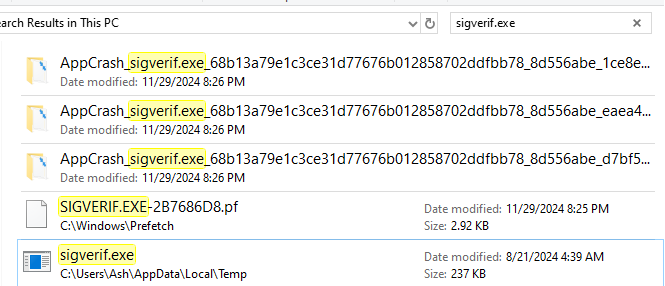 - Change cache.bak to sigverif.exe and copy to temporary file.