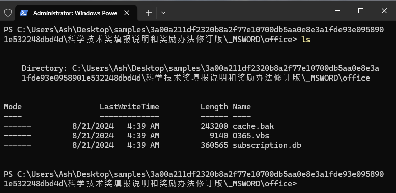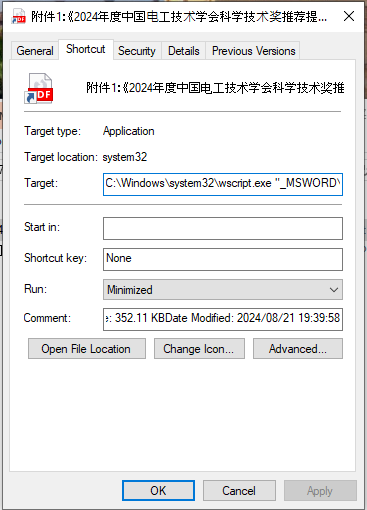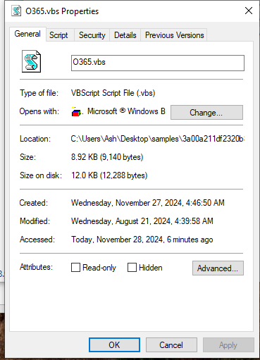 First file to analyze, the shortcut file, properties is listed. The general properties show the file size as 902B and 4096B on disk. Modified on August 21 2024 at 4:39:58A. The type being a shortcut linked file, with the description giving us an idea that its a script host. The actual target for this link is shown.- C:/Windows/system32/wscript.exe ” MSWORD/office/O365.vbs”.