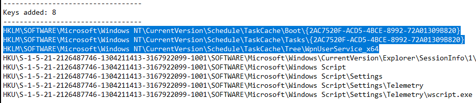 Running regshot tool allows us to see modifications of the registry pre and post running the sample, then compare the two hives. The list of keys added is listed where the new task scheduled can also be seen. We see the full GUID highlighted, WpnUserService x64 and wscript.exe. All of these are the result of running the sample.