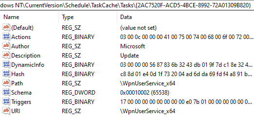 The task can also be viewed by the user using RegEdit tool and selecting the full correct path as can be seen. Included in the actions from HEX to decimal, we can see the running sigverif.exe binary called. Notice how the task created tries to seem like a normal registry key from the author being Microsoft and description as Update. Victims may not be able to tell immediately that this is malicious for these reasons, perhaps Microsoft should disallow the author as Microsoft from a scheduled task created by the user.
