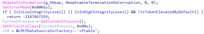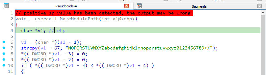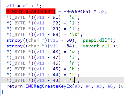 A lot of time went into decompiling and trying to reverse engineer the sigverif.exe beacon without much success. Debugging symbols found during static analysis can be loaded into the IDA disassembler which gives us function names. However, the majority of the binary looks to be a normal ImeBroker.exe executable because of the strings found and function headers. Notice however segments reveals the .text section is executable which is never normally the case. Our only hint in reversing this binary remains a region in memory which is executable. The easiest way to solve this is with a debugger.A second hint we found when taking a quick glance at the function, we noticed a hard- coded memory address in the decompiled code and a crafted string pointing to psapi.dll, msvcrt.dll and winhttp.dll. Take notice of the IMERegCreateKeyEx function called that creates registry keys too.