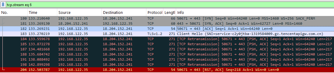 Wireshark capturing all outgoing and incoming network communication caused by the sample can be shown. The initial three-way handshake is successful with the select destination address but when TLS connection is initiated, the server does not respond. Our localhost tries multiple times to initiate the connection by sending the TCP packets with PSH and ACK flags. Finally the connection is reset with RST and ACK due to no response from the server. We can however see the service name as tencentapigw.com.cn revealing the sample hosting location. We suspect this address is not used anymore. Repeat attempts at establishing a connection is detailed in the Wireshark capture all failing. The last connection failure results in sigverif.exe crashing. However it isn’t clear whether the crash handler is executing commands on the localhost due to write and execute permissions set in specific memory addresses found earlier, or the binary really just crashes because of an unestablished connection.